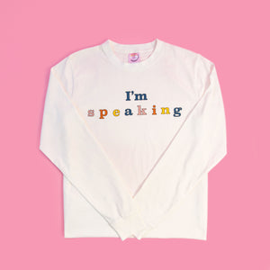 - "I'm speaking" printed on front in multiple fall colors, in honor of Kamala Harris' iconic moment, heard around the world by women everywhere